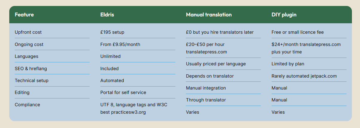 Traditional translation agencies price by word or by hour. If your product pages total 20 000 words and the average rate is £0.15 per word, you’ll spend £3 000 for one language – and that doesn’t include updating your CMS or ensuring SEO is correct. Agencies also require you to project manage revisions and file hand‑offs. Machine‑translation plugins promise low per‑month fees (starting around £20 translatepress.com) but require manual configuration and do not handle international SEO jetpack.com. Eldris bundles translation, cloning and deployment into one service. Your monthly subscription covers: